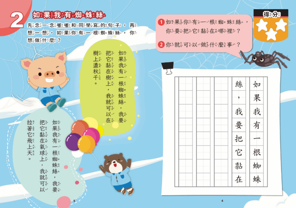 當孩子們對蜘蛛絲的「超能力」有了認知後,接下來老師運用講義中的情境引導圖,例如:小豬盪鞦韆、小熊飛上天,和小朋友進行角色扮演。
