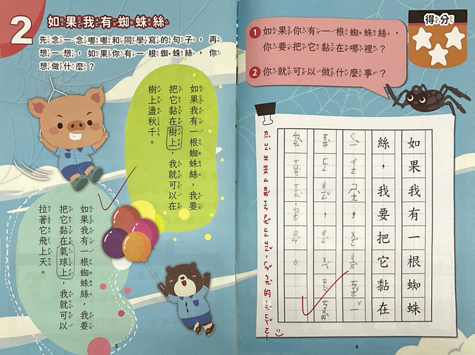 除了角色扮演,在口語互動過程中,老師也把寫作技巧:黏在哪裡→做什麼動作→達成什麼目的,同步教給孩子。