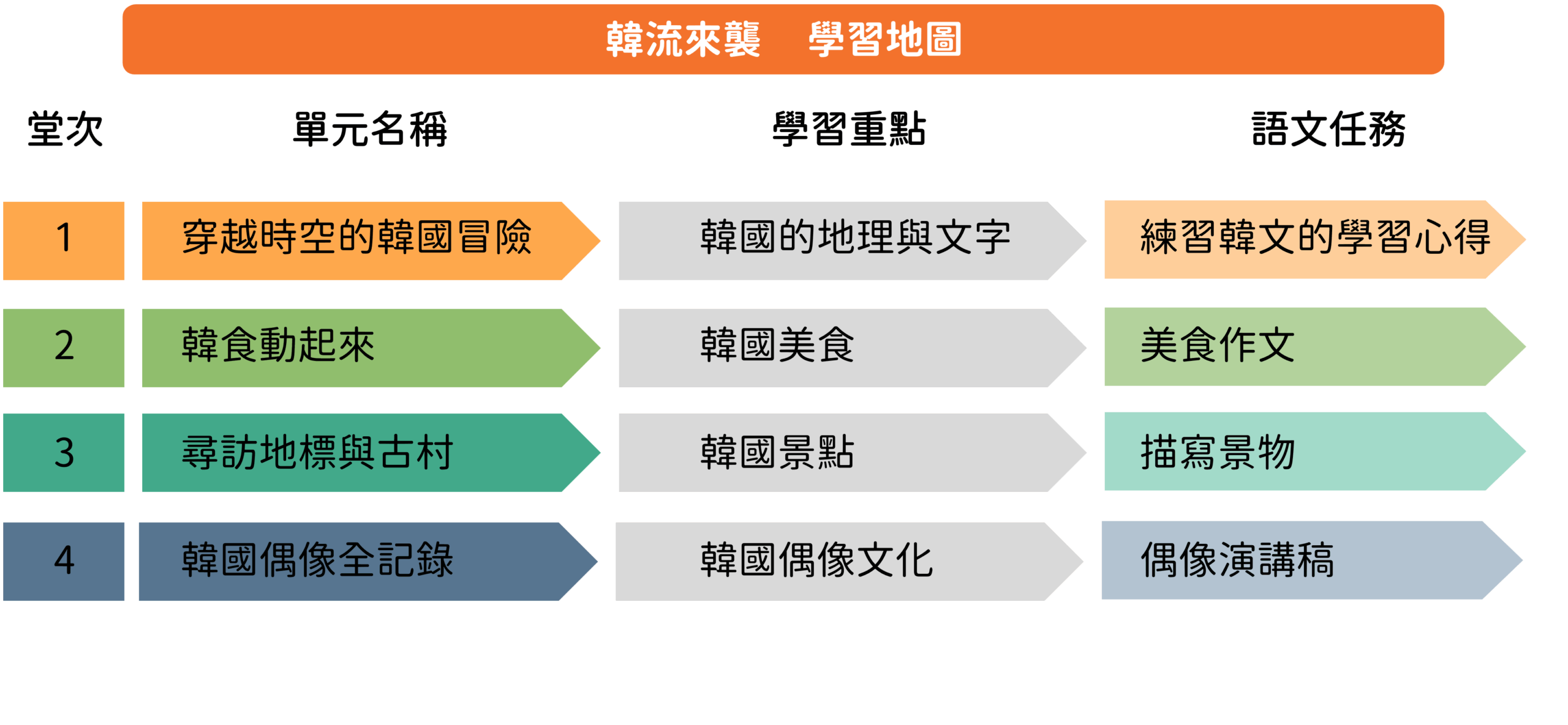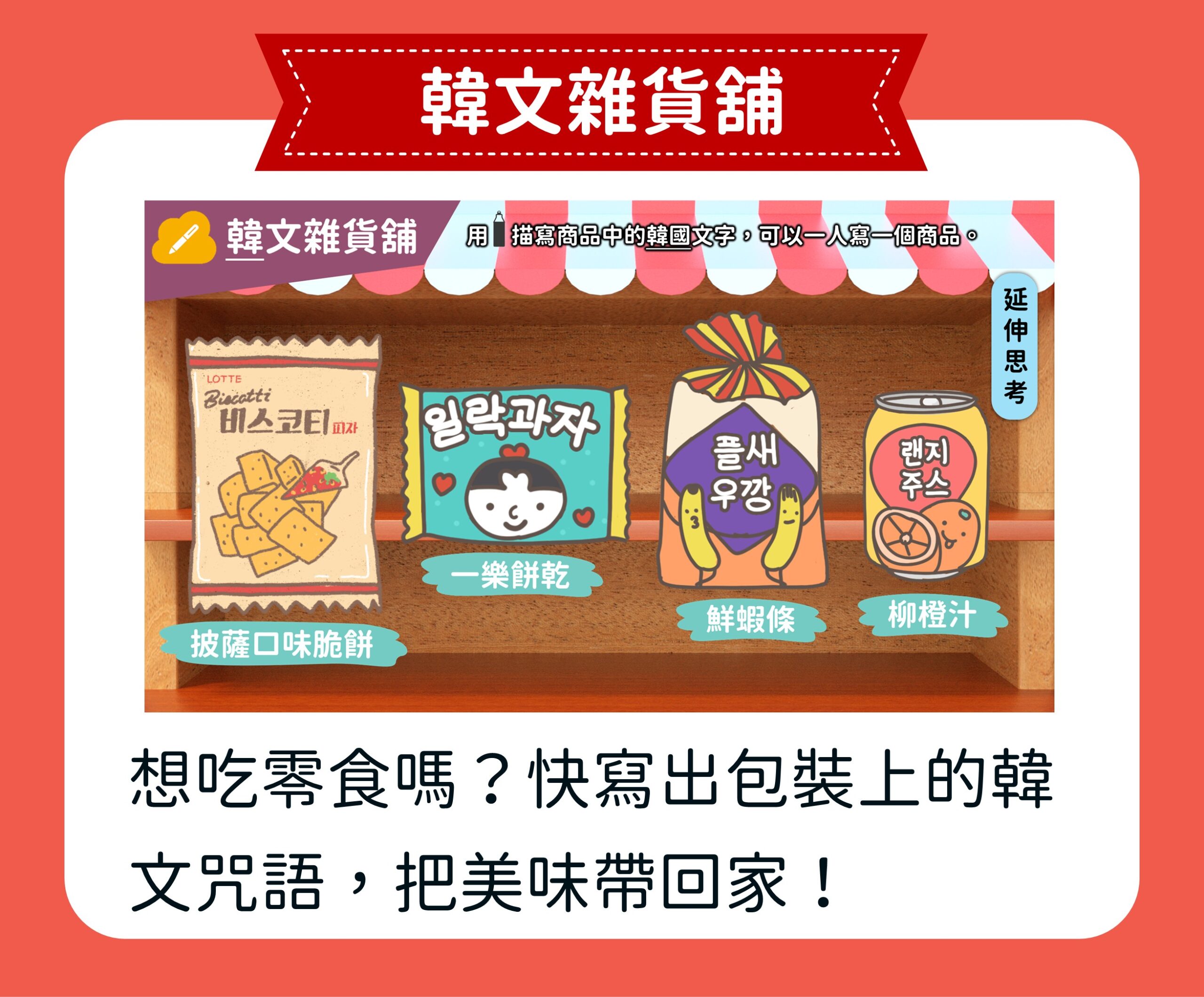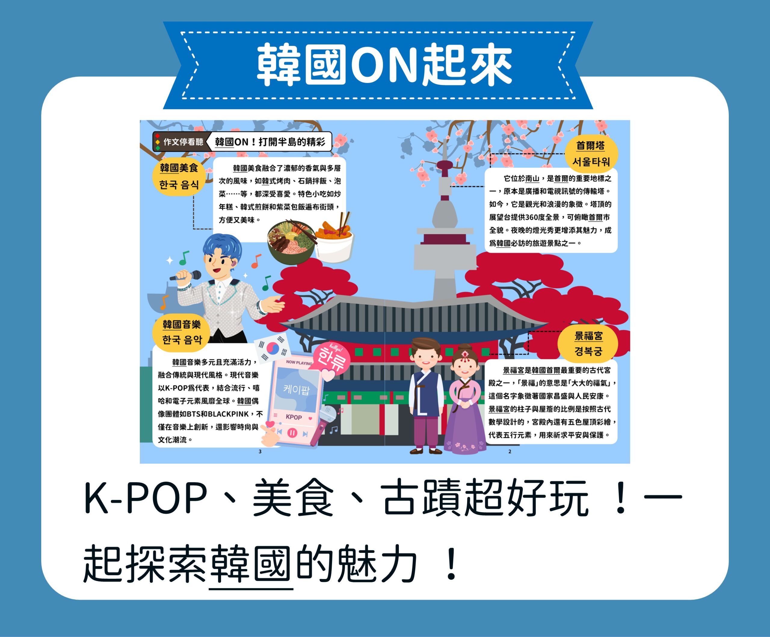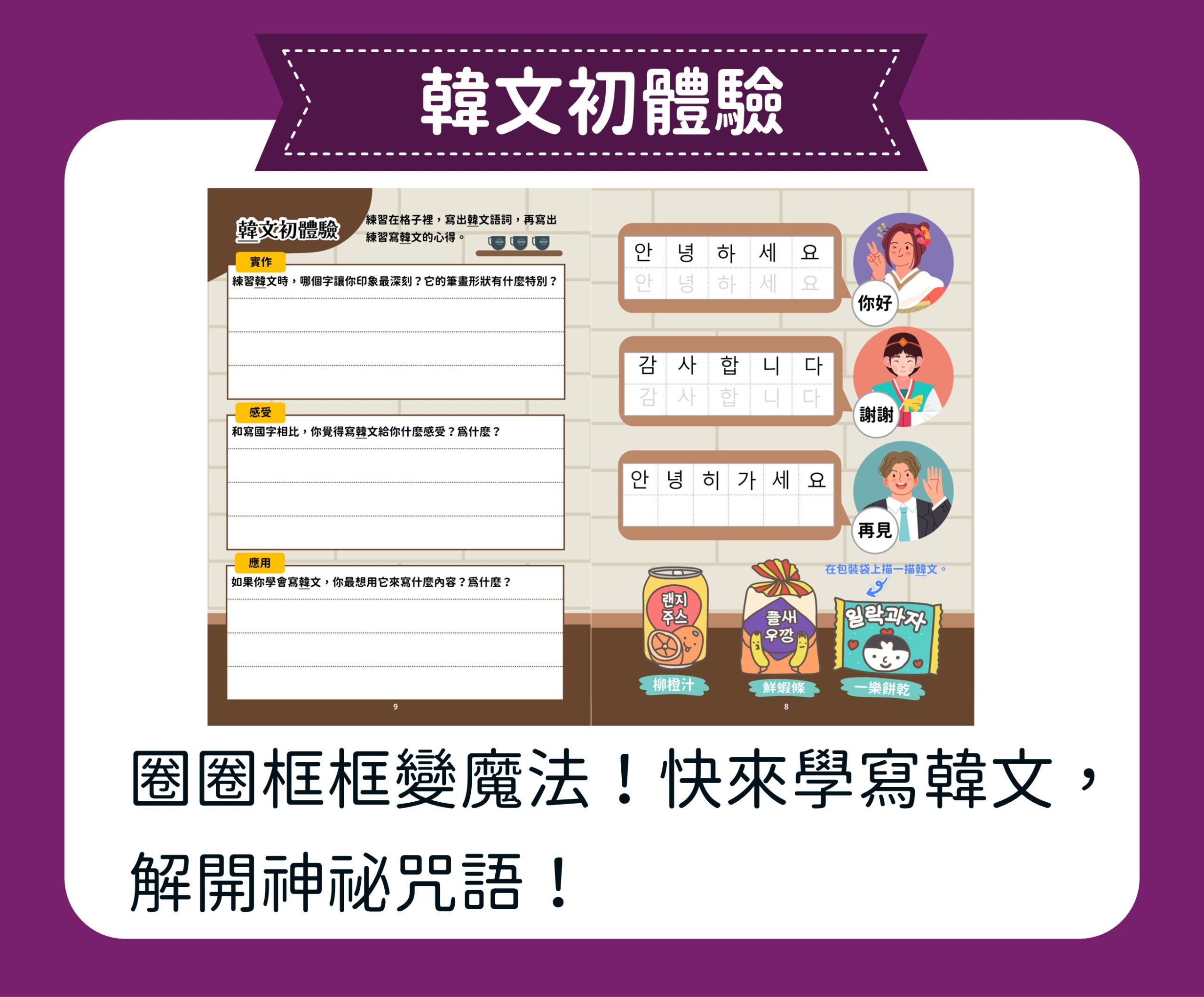 第一堂課「穿越時空的韓國冒險」:從認識韓國的地理與風貌開始,親手體驗韓文的圈圈方塊之美。引導孩子寫下「學習心得」,打開文化交流的第一扇窗。