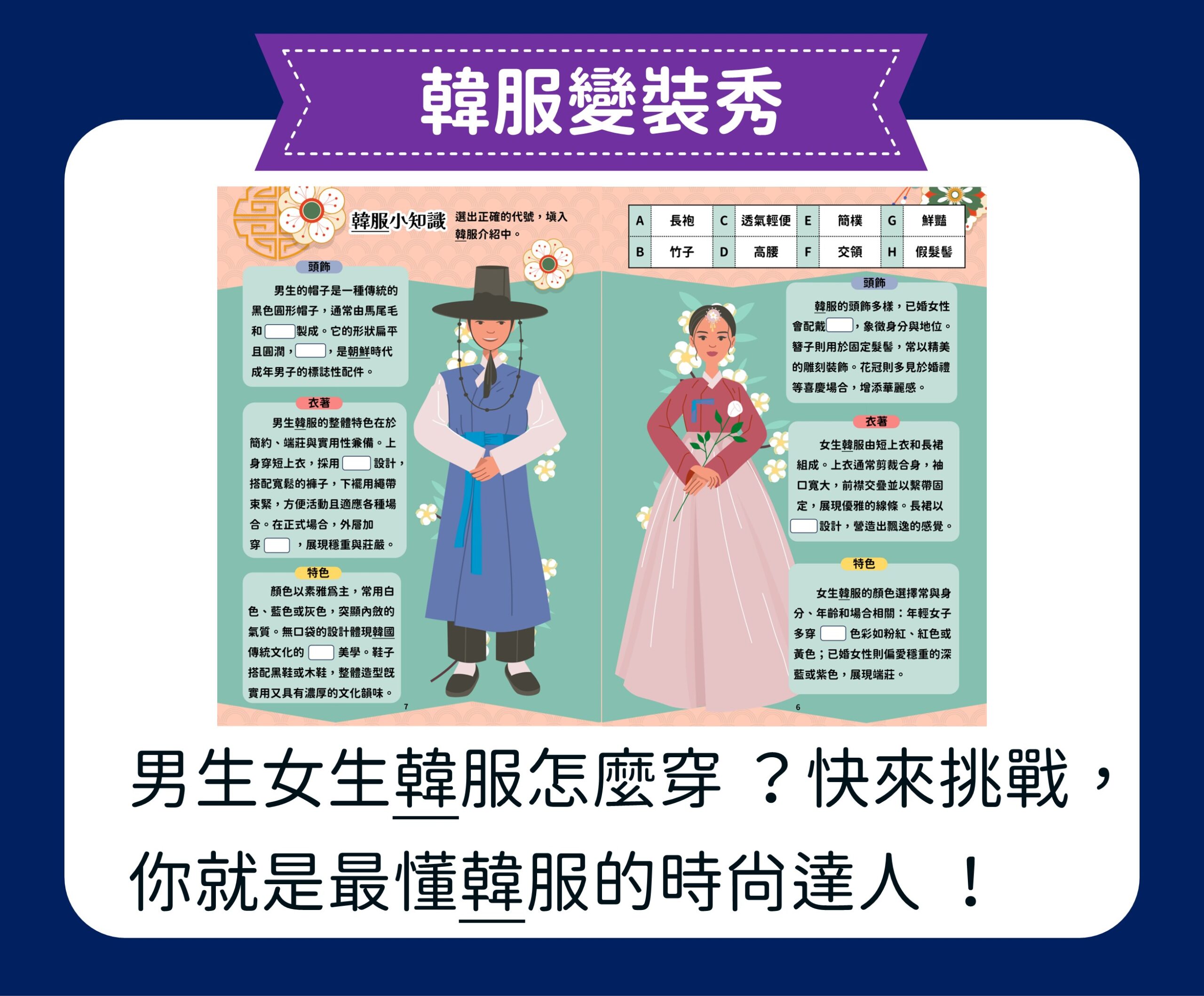 【韓流來襲】單元將帶孩子穿越時空,從地理風光到傳統韓服,甚至親手寫出獨特的韓文 ,深度體驗韓國文化的迷人魅力,開啟孩子的國際視野。