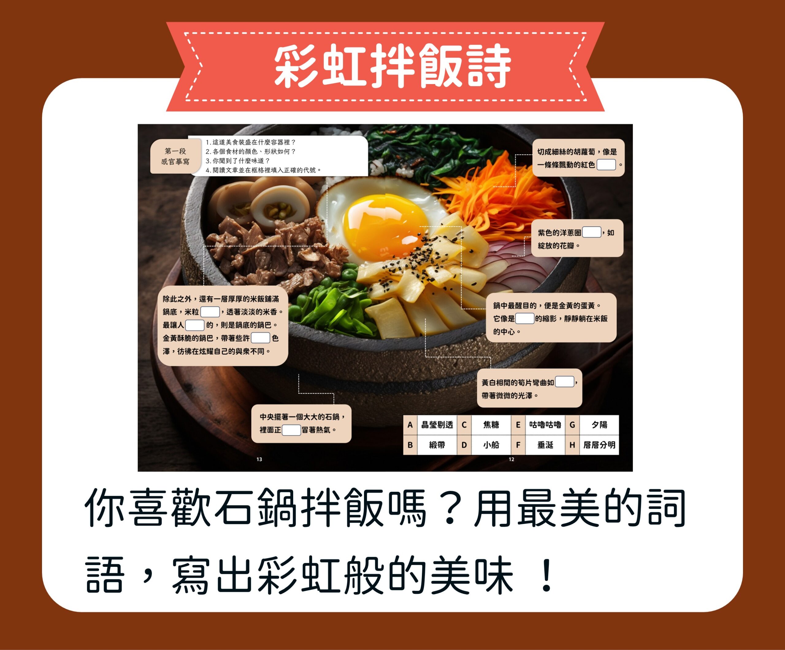 第二堂課「韓食動起來」:如何用文字寫出韓式煎餅的美味?本堂課將帶孩子探索韓國美食,學習運用五感,寫出令人垂涎三尺的「美食作文」。
