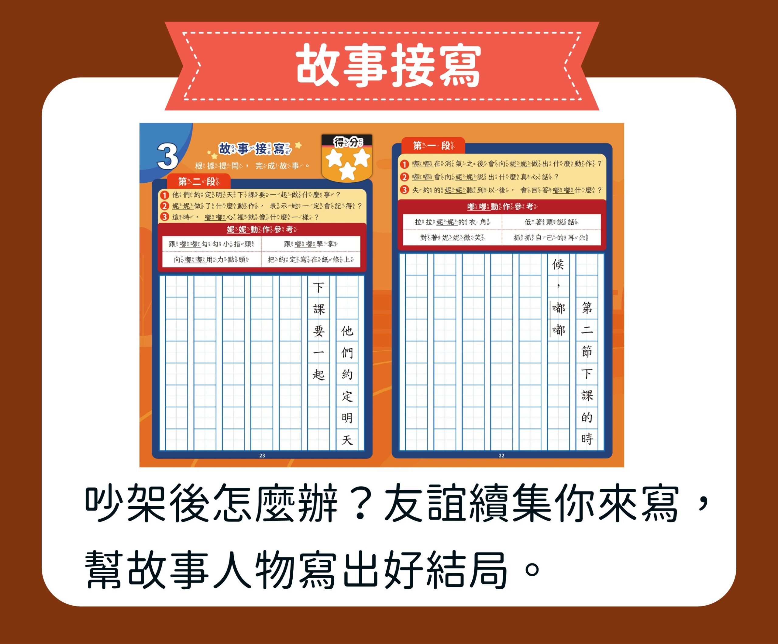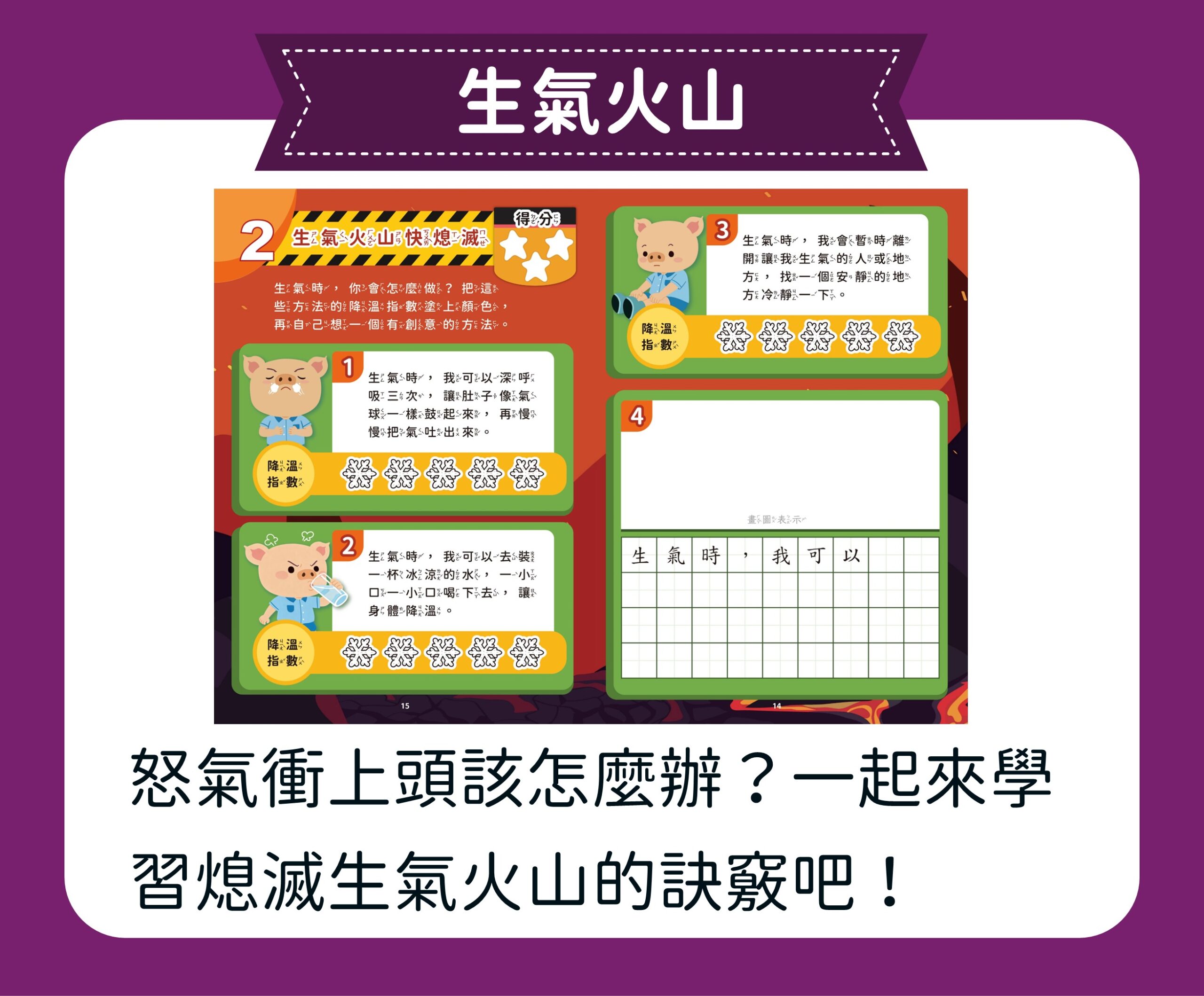 第三堂課「友誼火山爆發了!」:學習管理生氣情緒,陪孩子深呼吸。藉由故事練習生動的段落寫作。