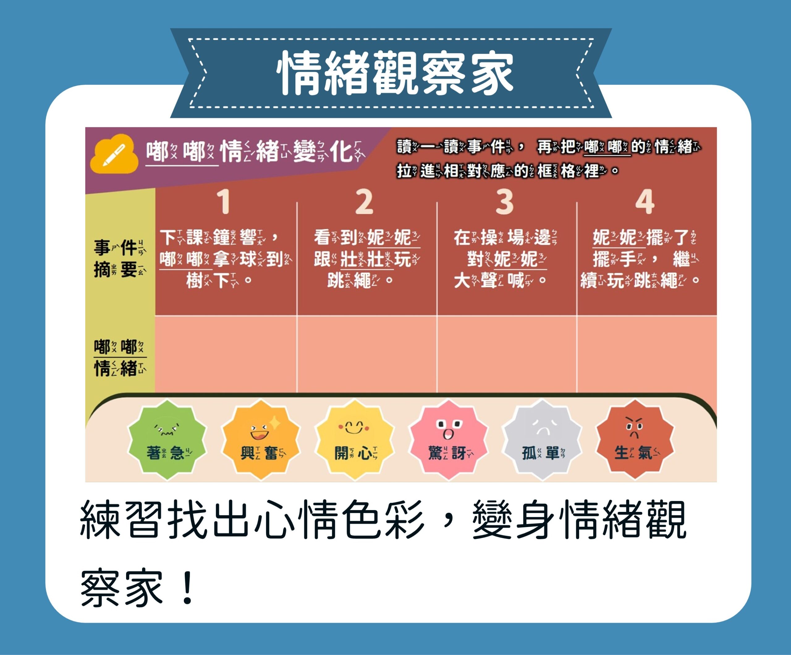 【情緒停看聽】單元引導孩子「停」下腳步觀察、「看」清問題核心、「聽」見他人心聲。我們將情緒管理的智慧融入日記、段落與故事創作中,幫助孩子在文字中梳理心情,成為既懂自己、也溫暖他人的小寶貝。