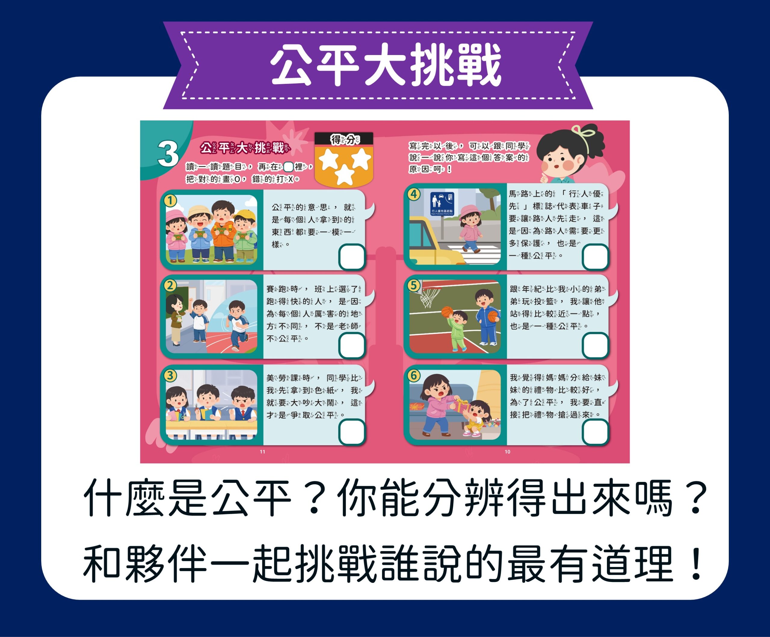 第二堂課「這樣公平嗎?」:分辨需要與需求的不同,明白公平真實意涵,進行情境判斷練習。