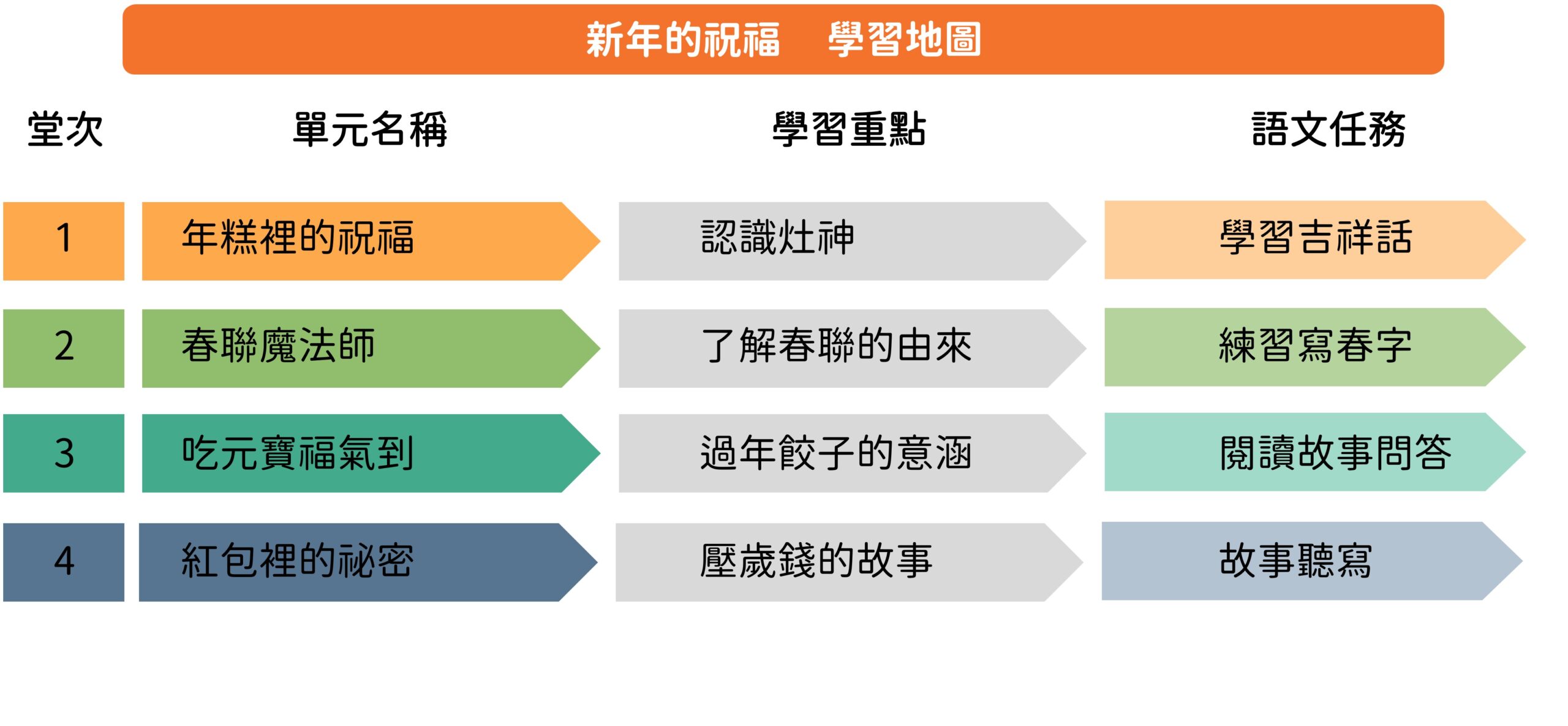 【新年的祝福】本單元將帶孩子從年糕、春聯、餃子、紅包等四個新年故事出發,認識傳統習俗,學習感恩與祝福,在活動與寫作中,感受滿滿的年節幸福。