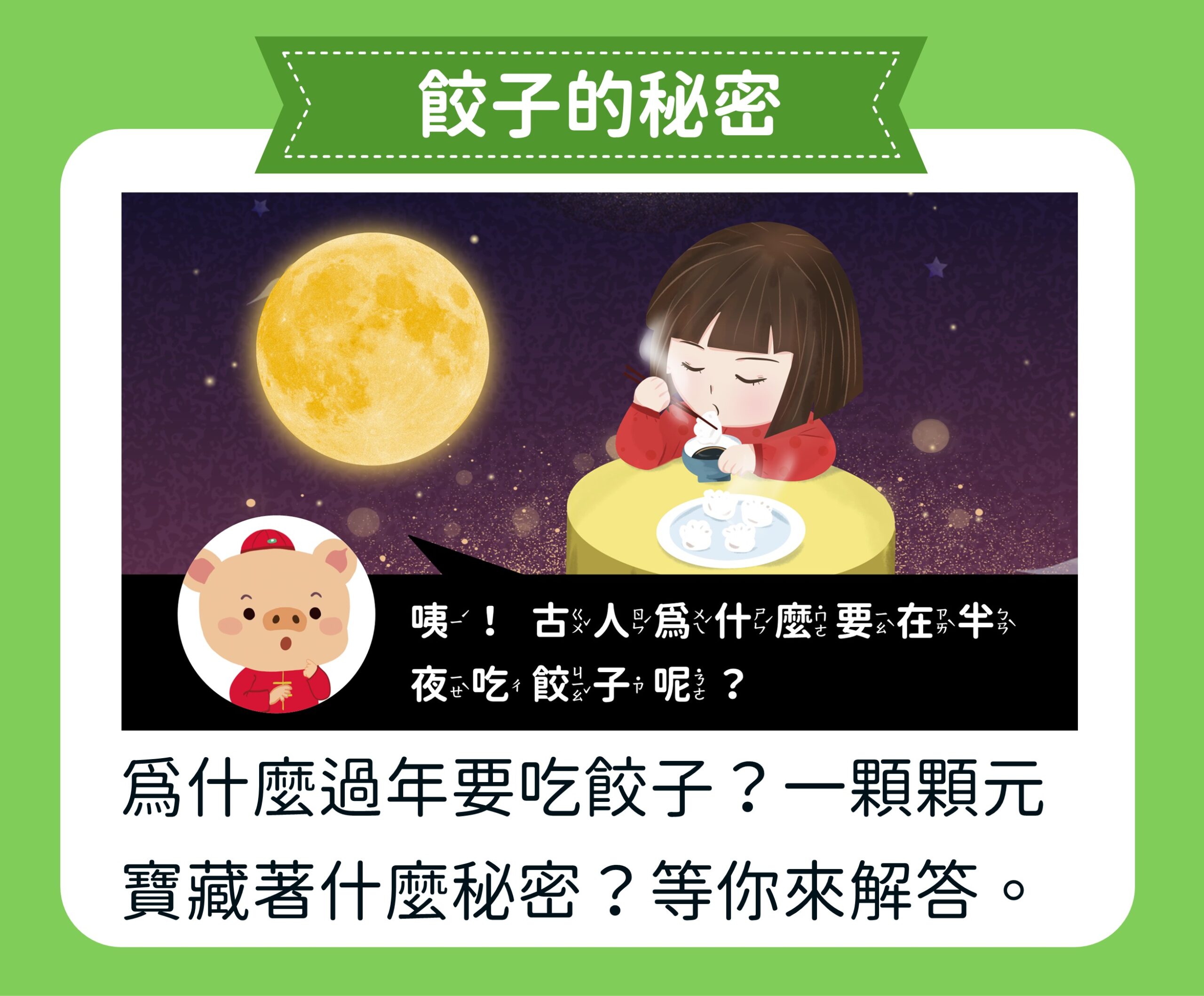 第三堂課「吃元寶福氣到」:餃子為何象徵元寶?本堂課將從「嬌耳湯」的典故,帶孩子了解餃子的溫暖意涵。