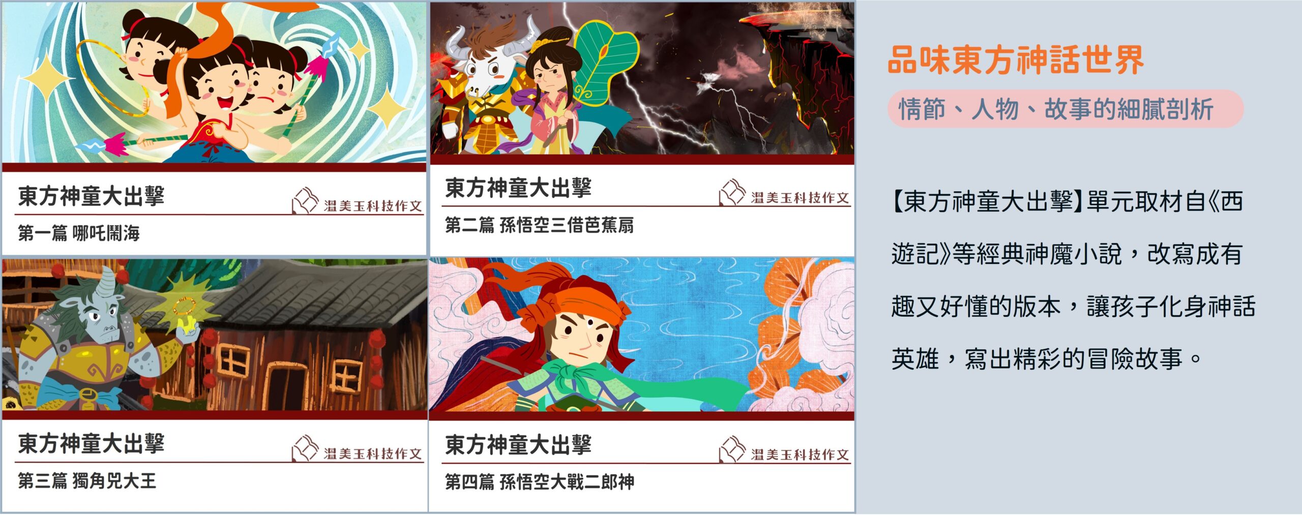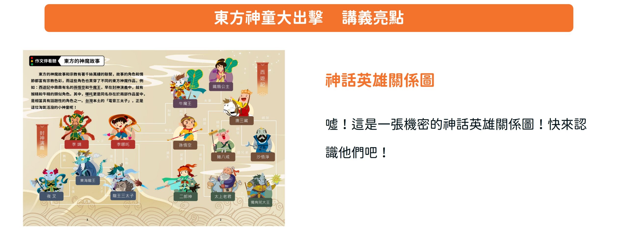 【東方神童大出擊】單元取材自《封神演義》、《西遊記》等經典神魔小說,改寫成有趣又好懂的版本,讓孩子化身神話英雄,寫出精彩的冒險故事。