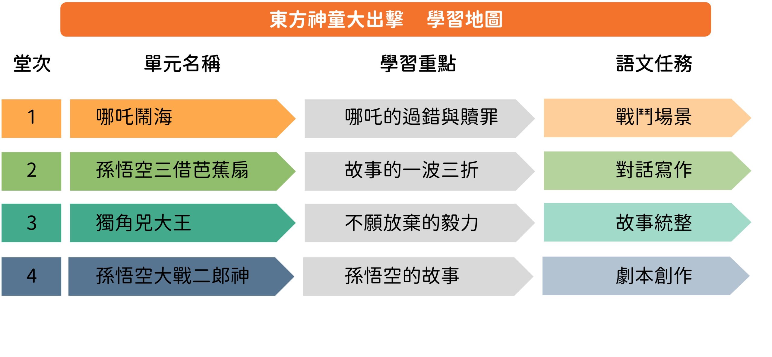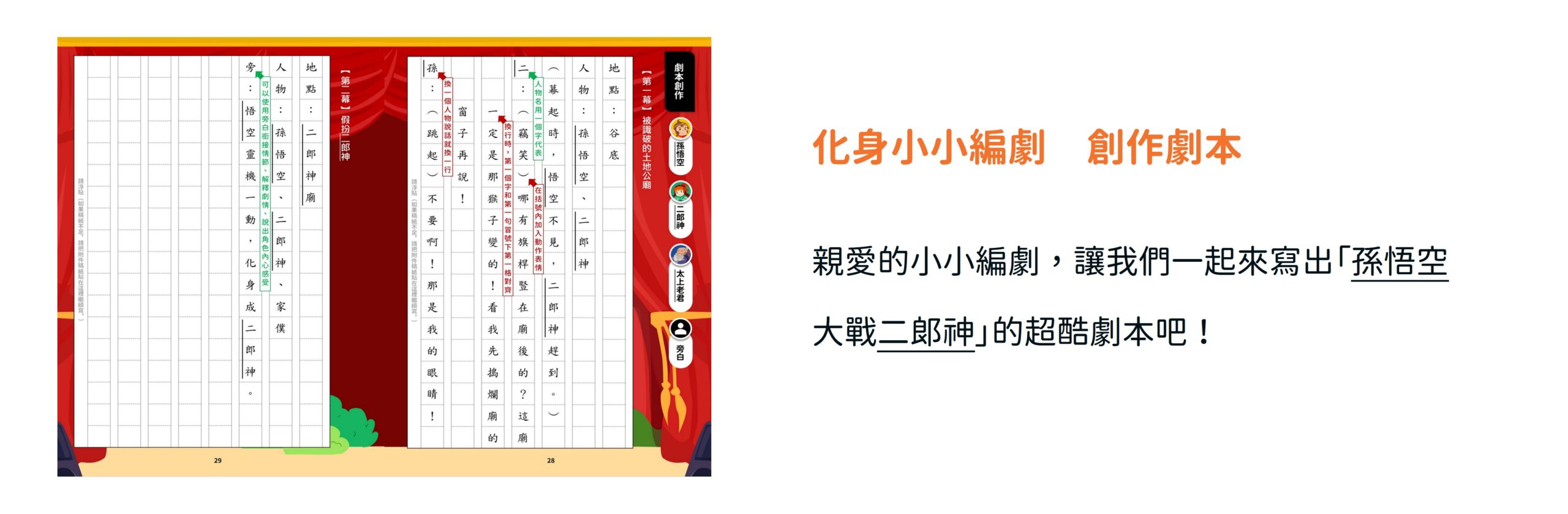 第四堂課「孫悟空大戰二郎神」:將經典場面,變成一齣好戲!本堂課將引導孩子挑戰「劇本創作」,跳脫傳統框架,用更活潑的形式來創作。