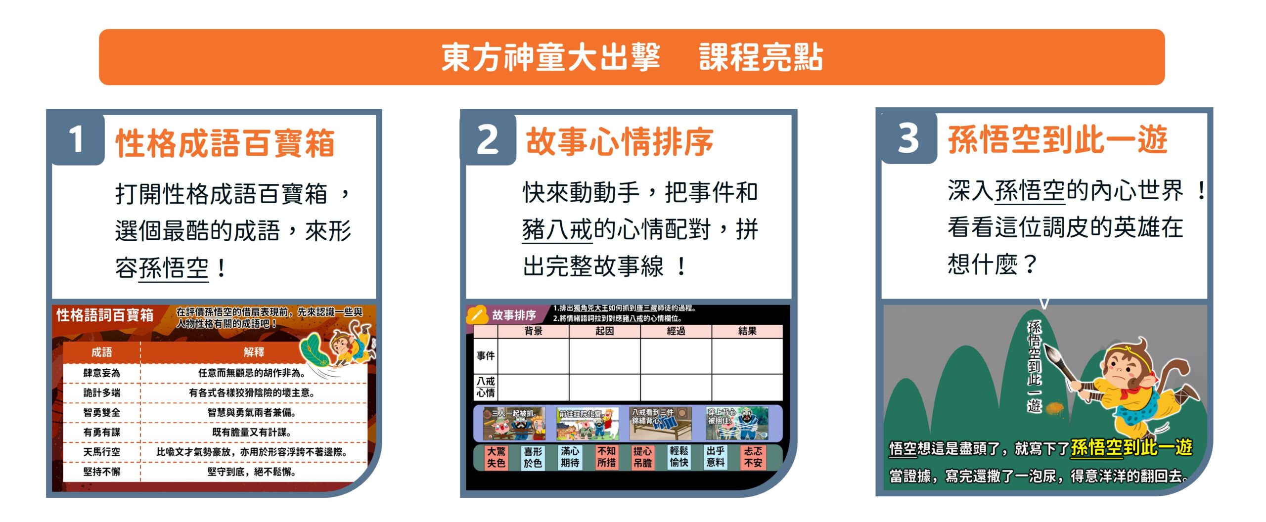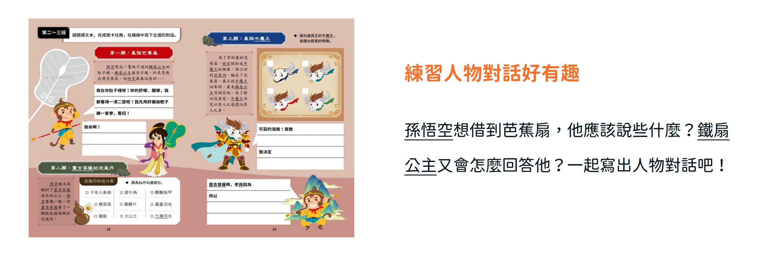 第二堂課「孫悟空三借芭蕉扇」:帶領孩子品味一波三折的故事情節,學習如何設計「人物對話」,凸顯角色的鮮明個性。