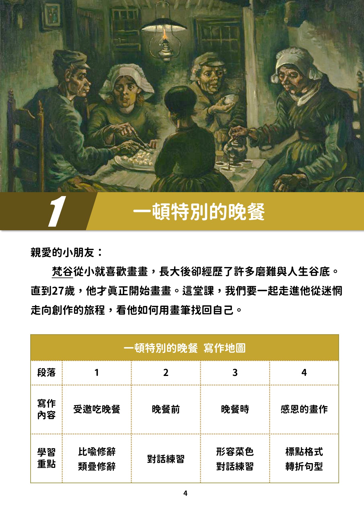第一堂課「一頓特別的晚餐」:從梵谷的起點,看見夢想的萌芽。從故事感受梵谷不被理解的心情,並練習寫出「鼓勵的對話」,學會用言語給予他人力量。