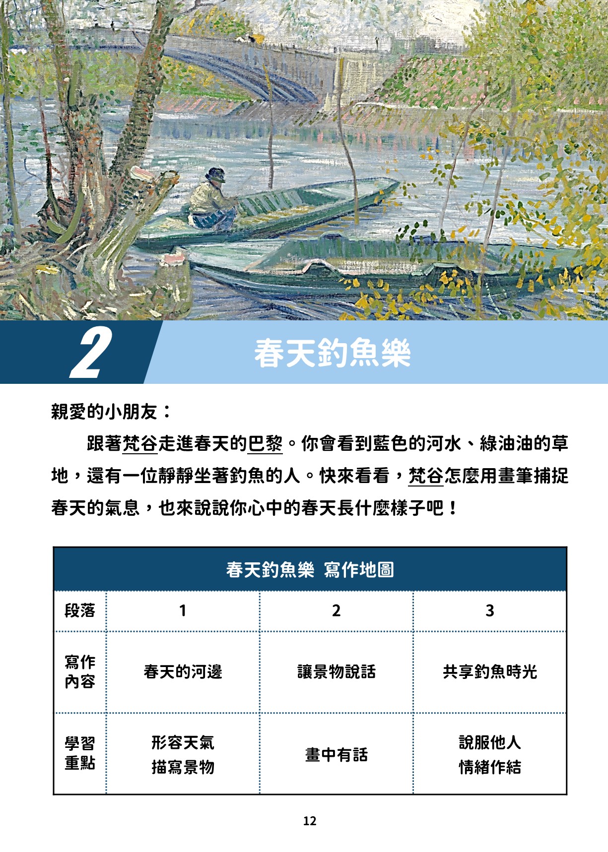 第二堂課「春天釣魚樂」:本堂課將學習梵谷如何將情感注入景色,並練習運用「擬人手法」,賦予景物生命與個性。