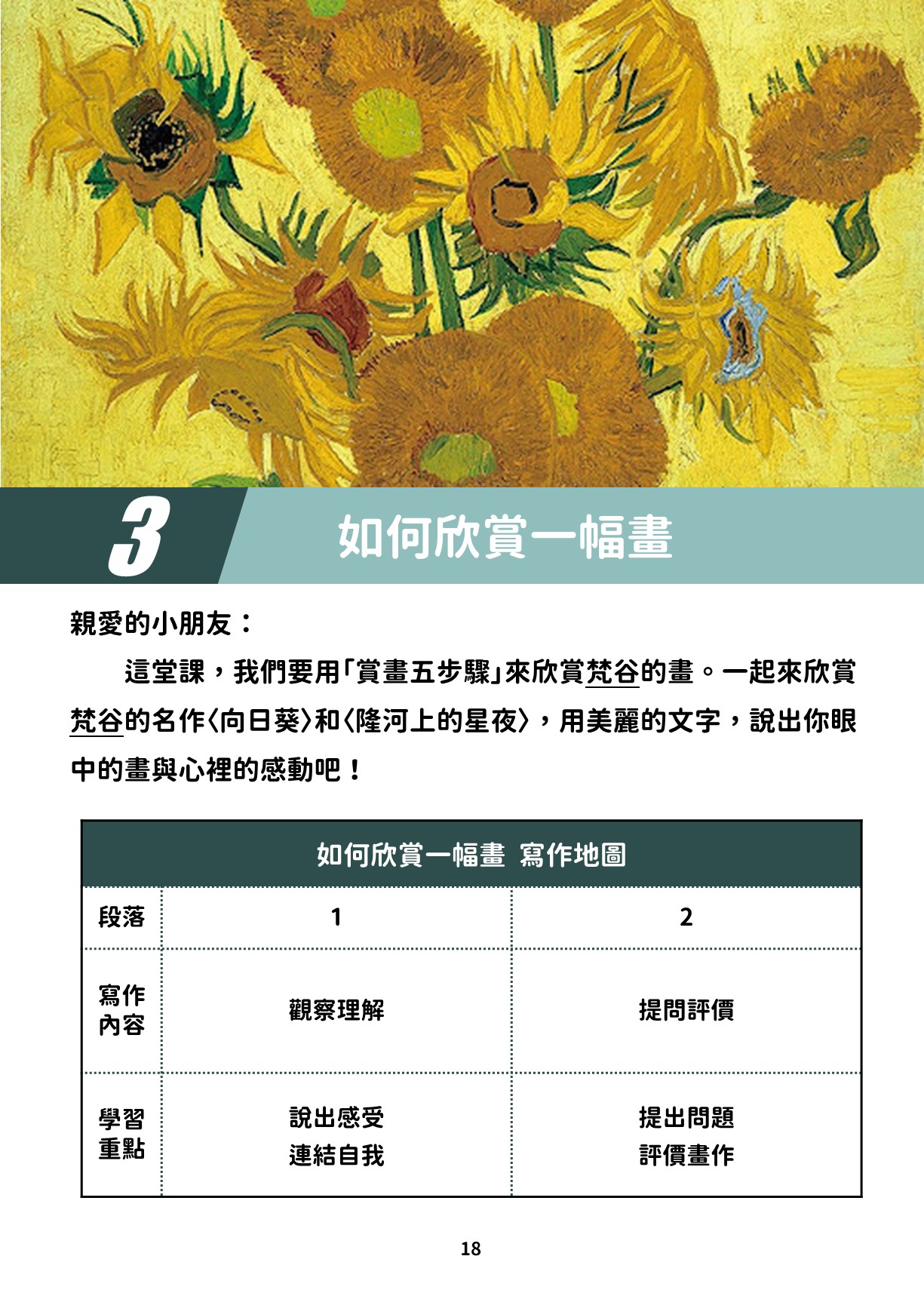 第三堂課「如何欣賞一幅畫」:利用「賞畫五步驟」,引導孩子有系統地欣賞藝術,並將觀察轉化為有條理的文章,培養孩子的藝術鑑賞力與論述能力。