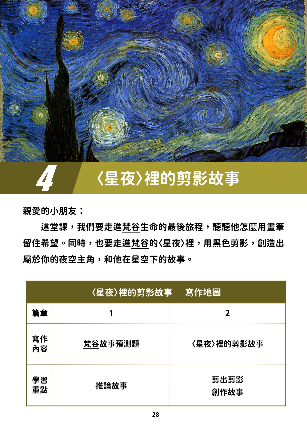 第四堂課「星夜裡的剪影故事」:從梵谷的故事體會尊重生命價值的意義。再進入梵谷《星夜》畫中,帶孩子玩剪影、寫故事。