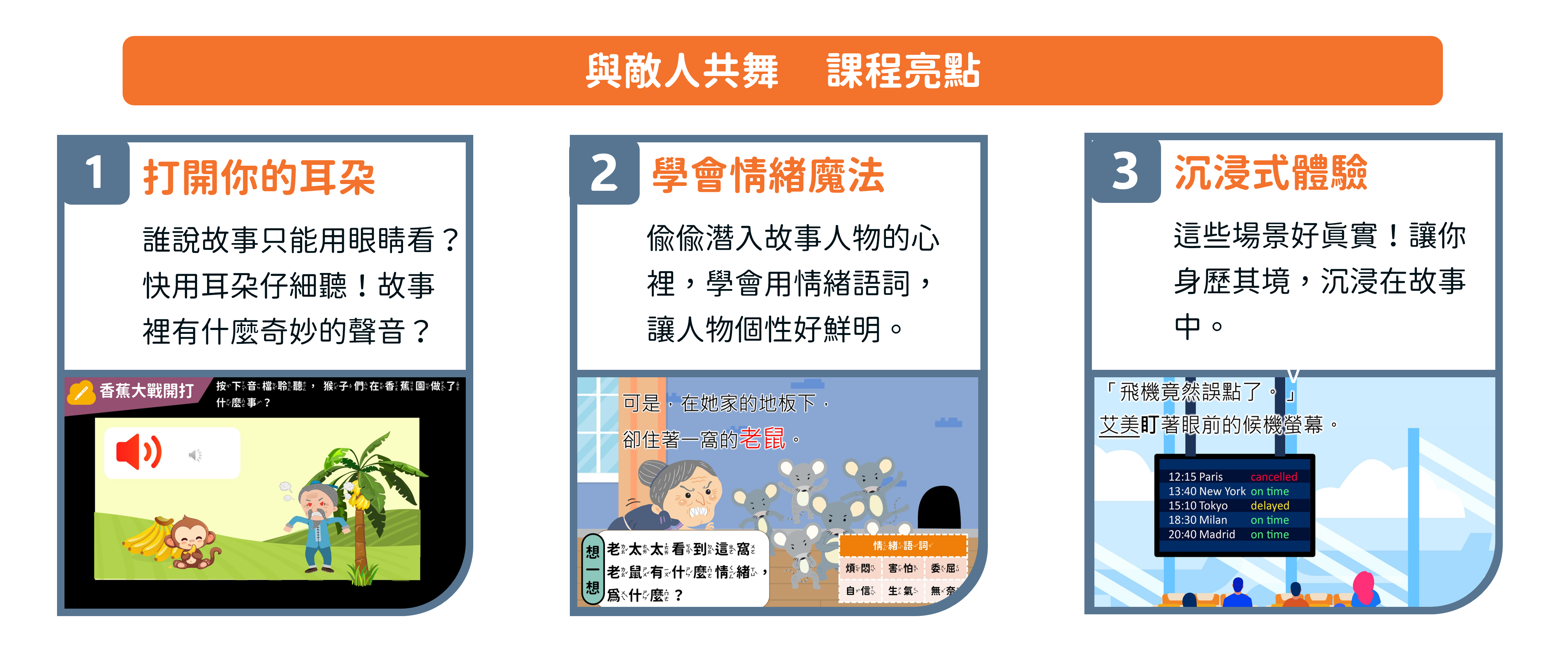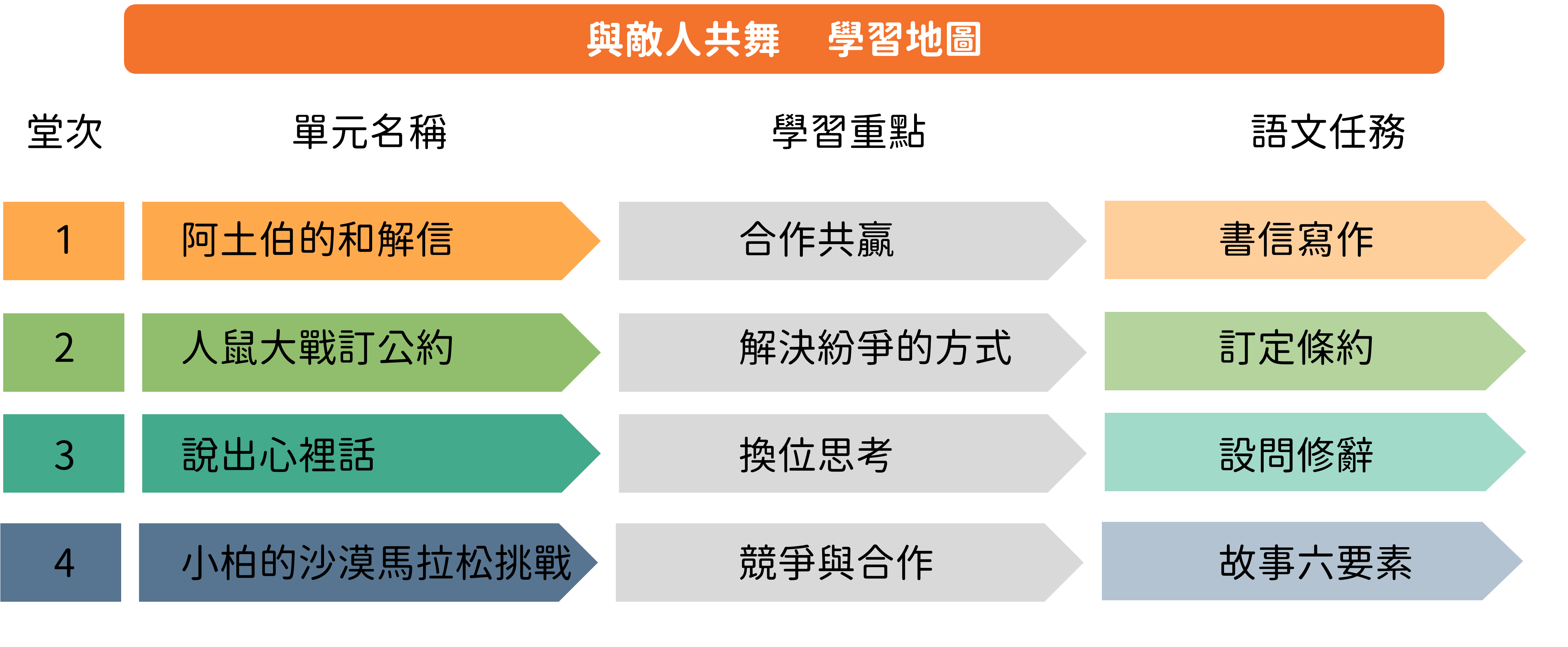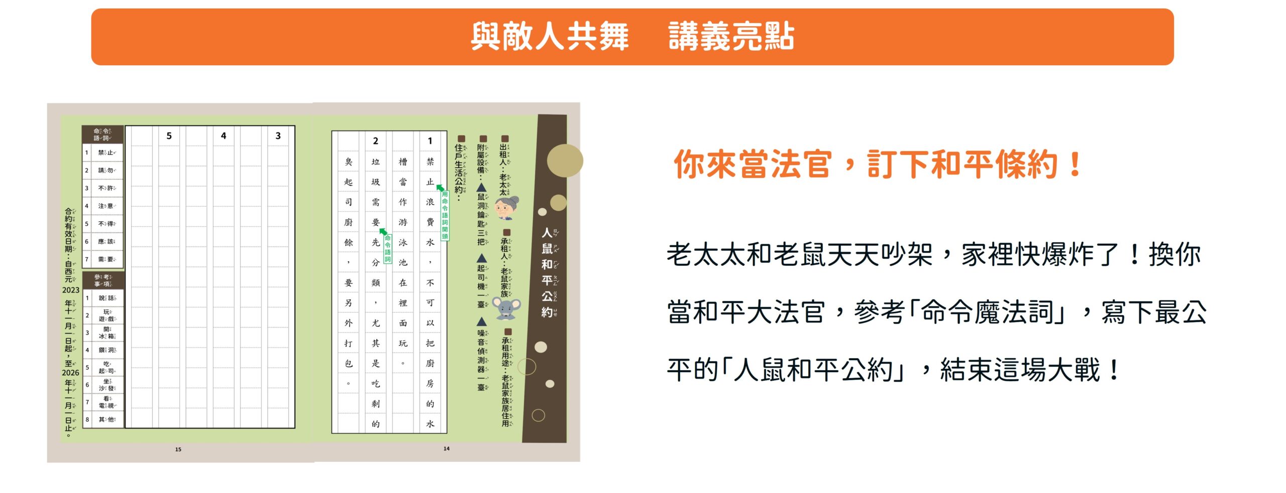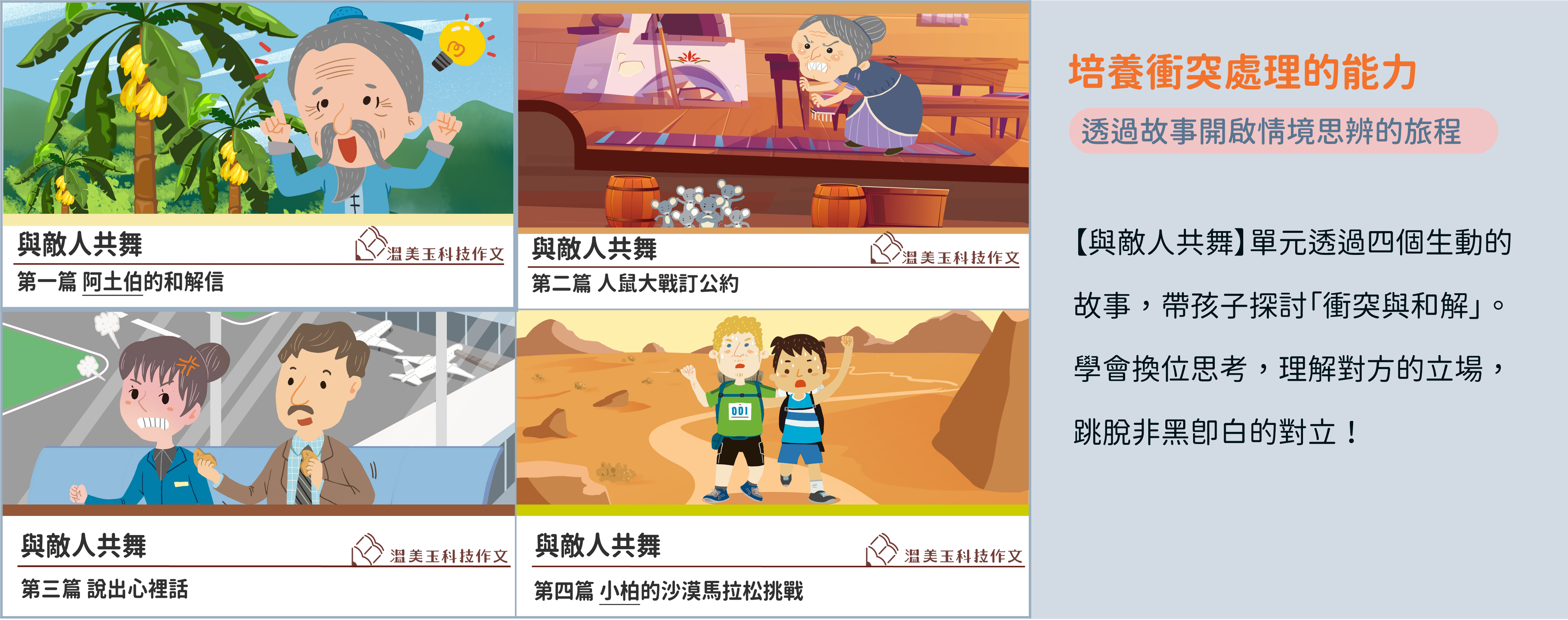 【與敵人共舞】單元透過四個生動的故事,帶孩子探討「衝突與和解」。學會換位思考,理解對方的立場,跳脫非黑即白的對立!