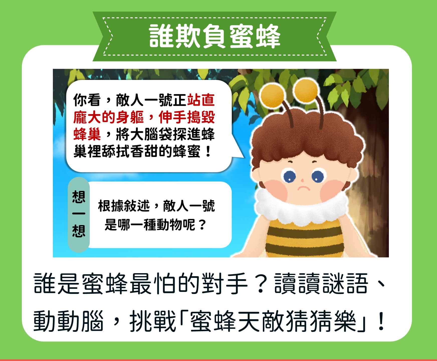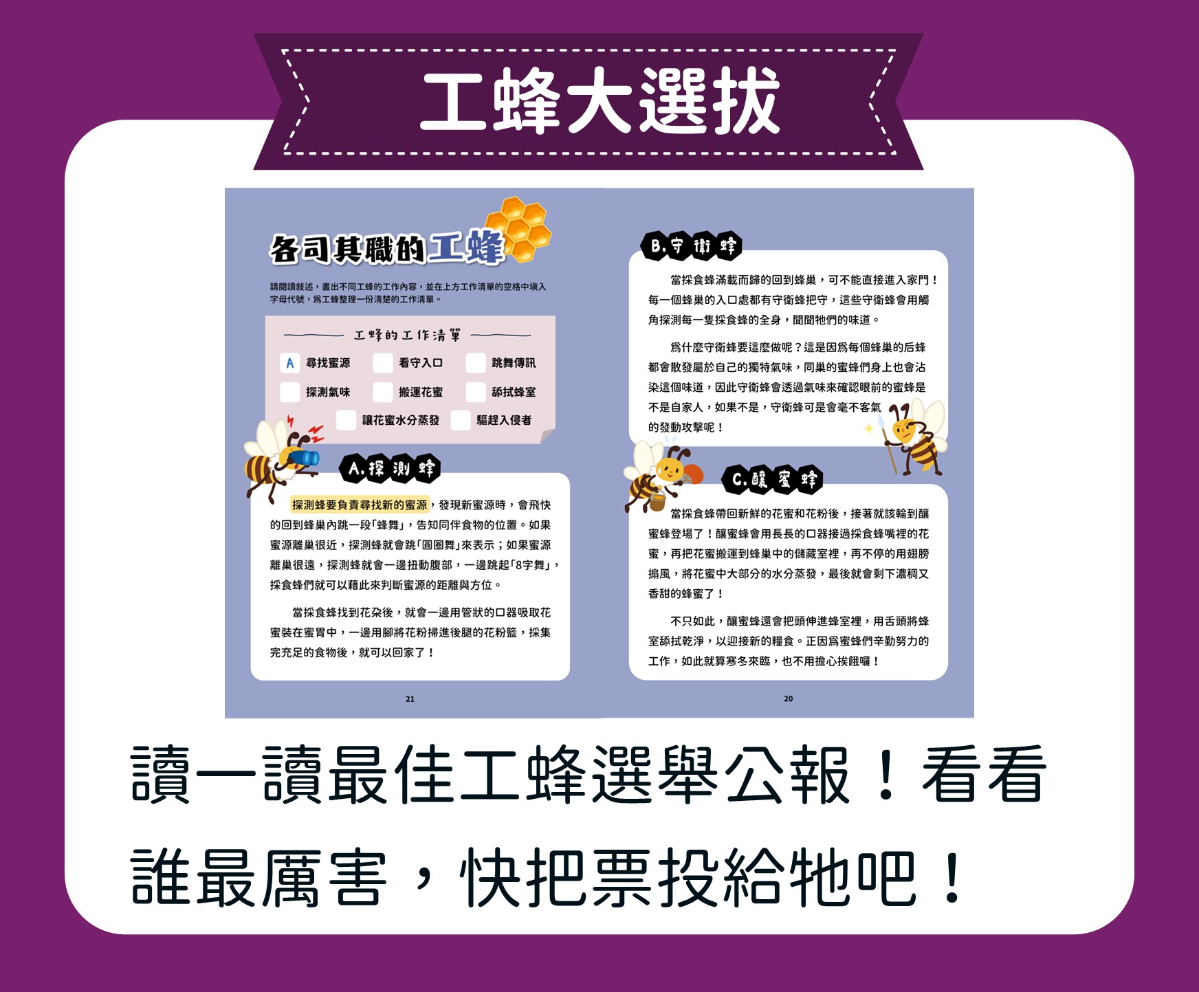 第三堂課「最佳工蜂選拔賽」 工蜂是蜂巢裡最辛勤的勞動者。孩子在認識工蜂的同時,也更深入理解蜜蜂生態,並以擬人手法進行劇本創作,學習不同文體的寫作。