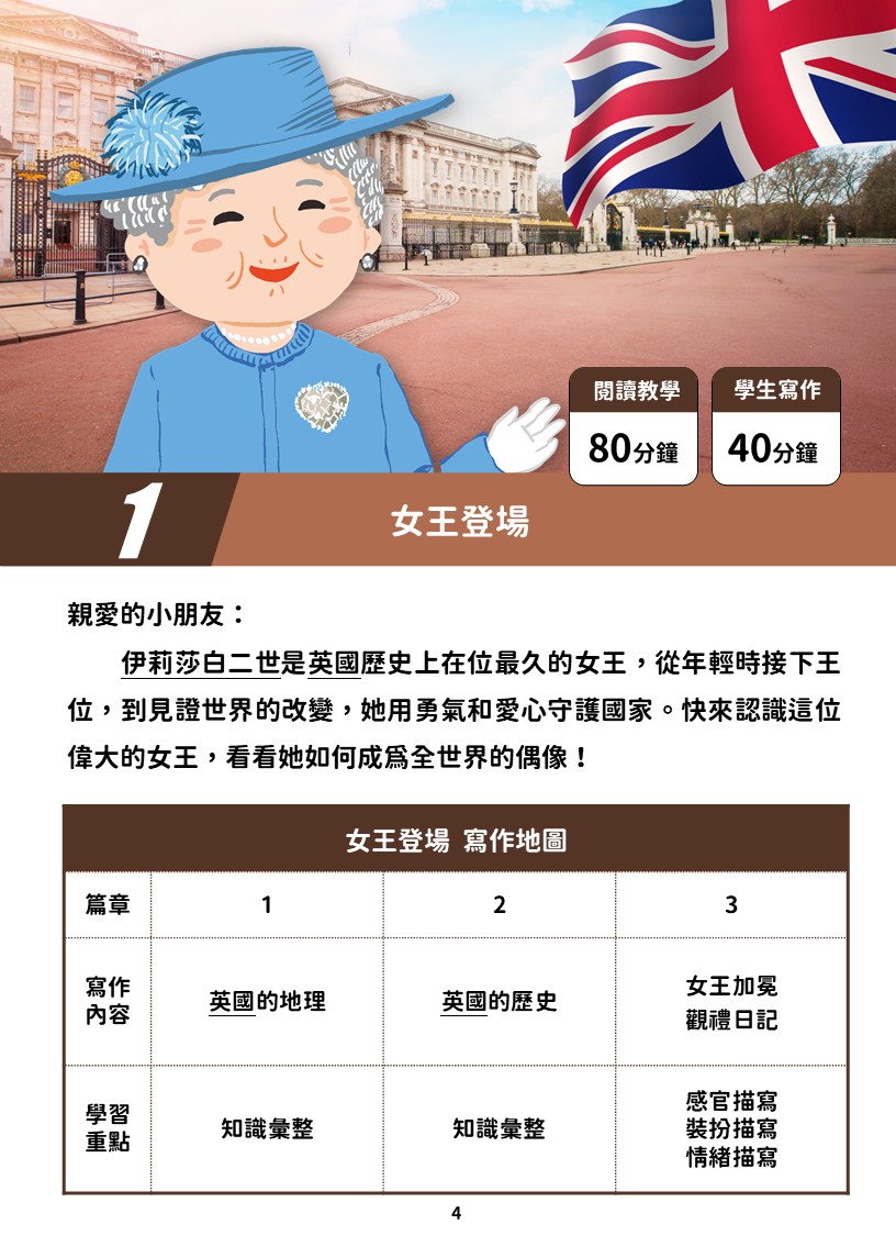 第一堂課「女王登場」:認識英國女王伊莉莎白二世的人物風采;練習「看圖寫作」,觀察細節、描述畫面。